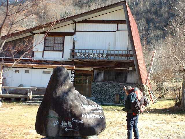 林道と分かれて近道を登りきれば穂高平の避難小屋である。12:18記念写真を撮ってすぐに出発する。