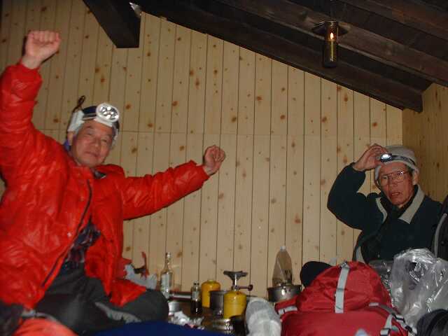 小屋帰着5:15、食事開始6:00、現在19:26。一杯飲んでご機嫌。