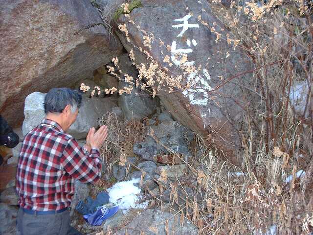 チビ谷10:12。滝谷で遭難した三好氏の知人、後藤邦彦氏の霊にケルンを積み、ヘネシーを注いで黙祷を捧げる。