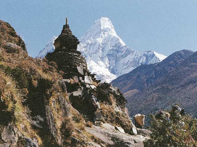 「母の首飾り」と呼ばれるアマダムラム6812mを背景にチョルテンの前を行く。